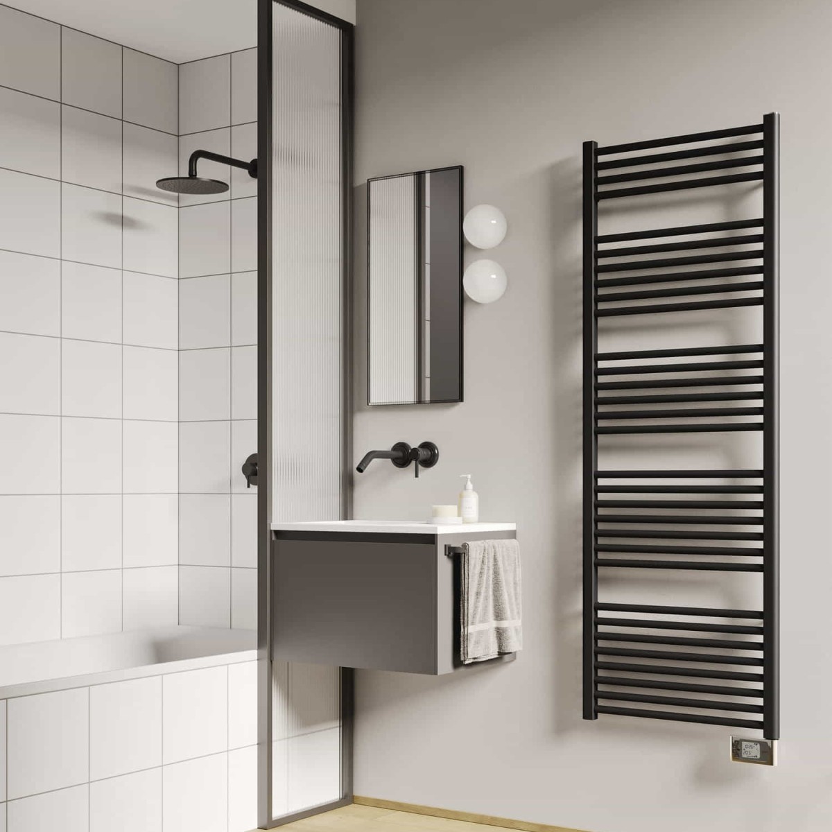 SOUL radiateur seche-serviettes electrique 750W, blanc, 1418x550x50mm. NF. IP44. TelecommandeWIRELESS sans fil avec programmation hebdomadaire incluse, positionnement special PMR. Fluide caloporteur. Collecteurs droite. IRSAP