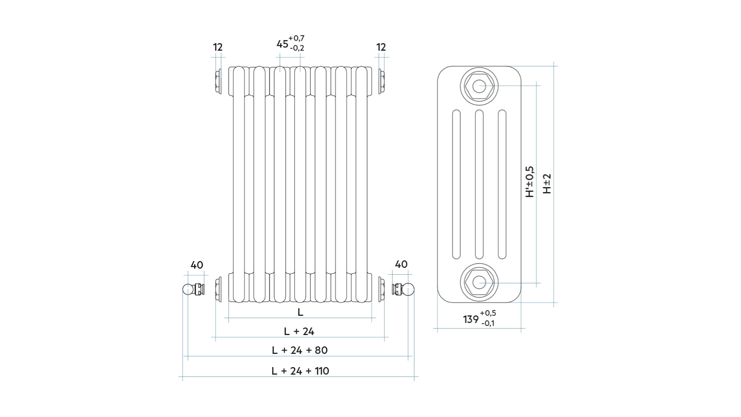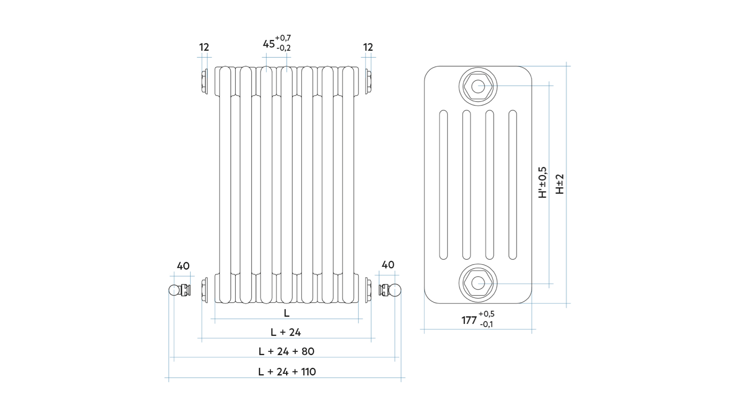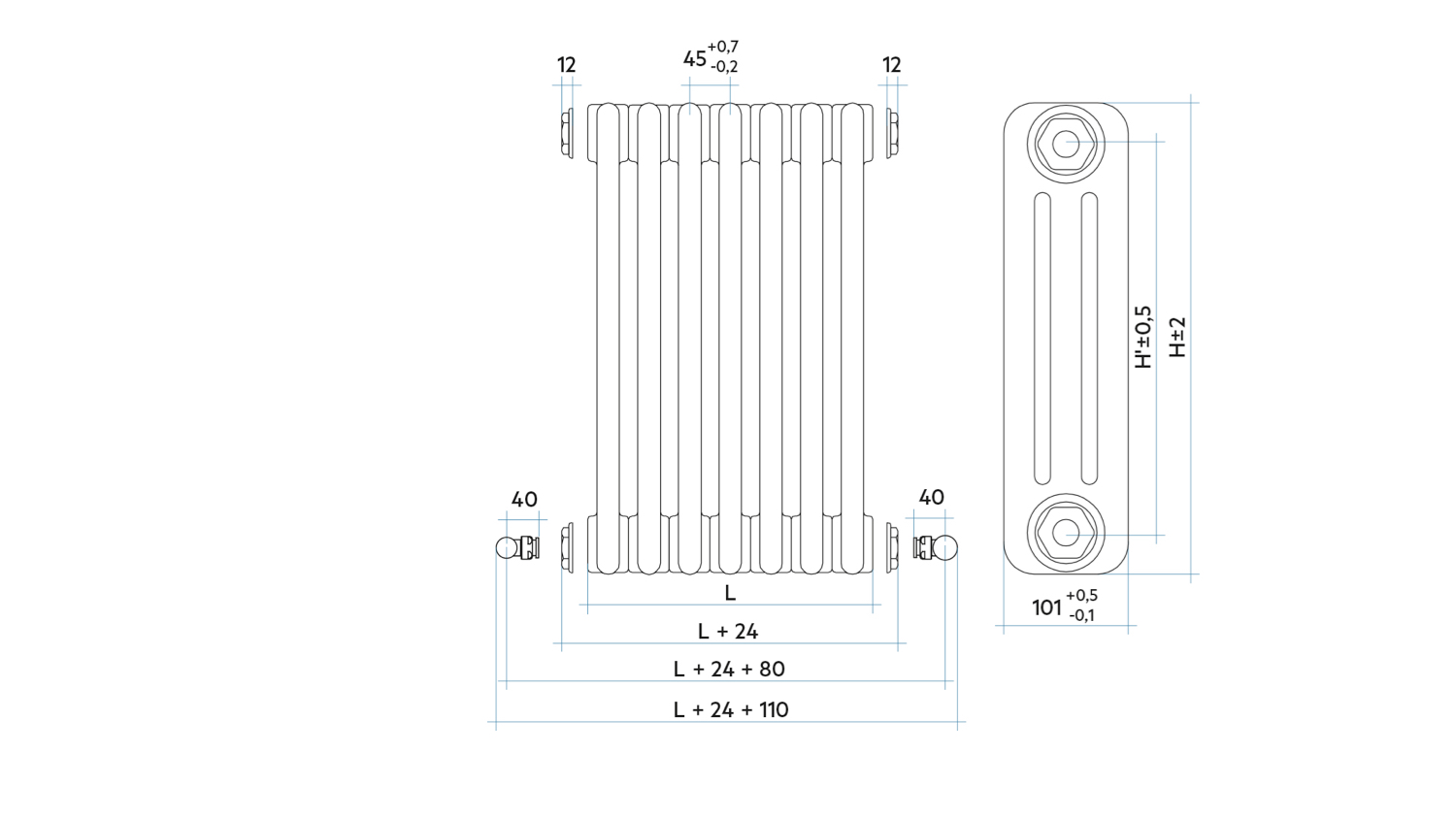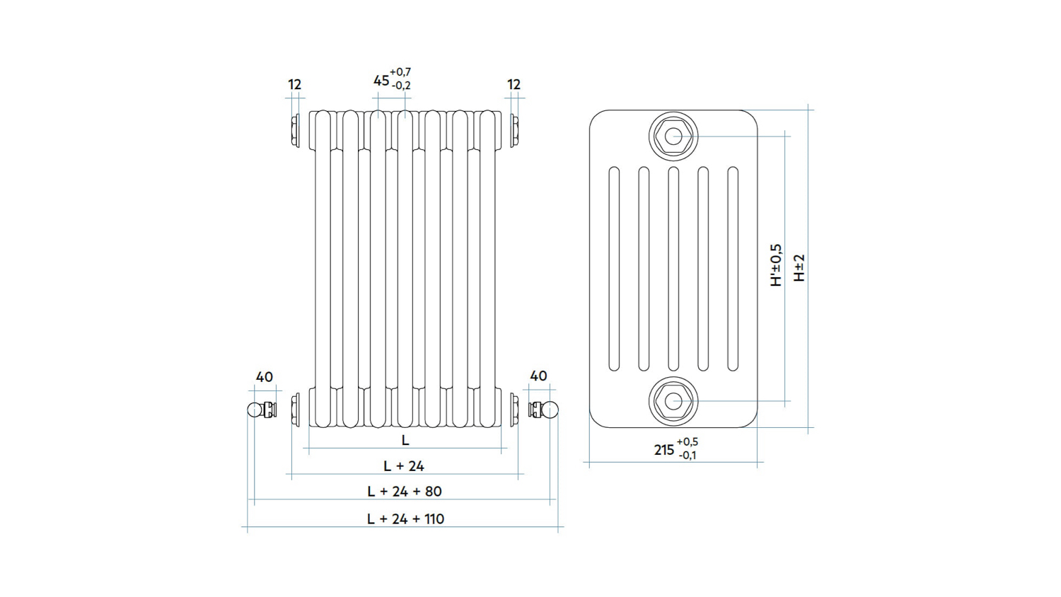 TESI 6 radiateur decoratif chauffage central 2040W, blanc, 400x1170x215mm. Ideal basse T°C (ΔT30=1045W). NF. Raccordement hydraulique lateral standard : 4 reductions 1/2" montees d'usine. Garantie 10 ans. IRSAP